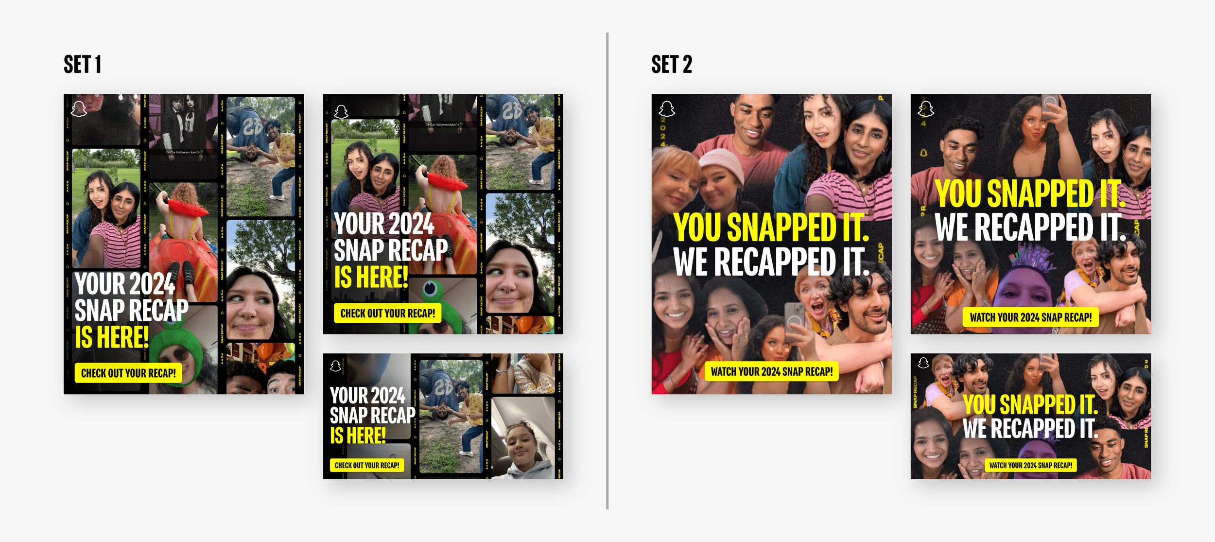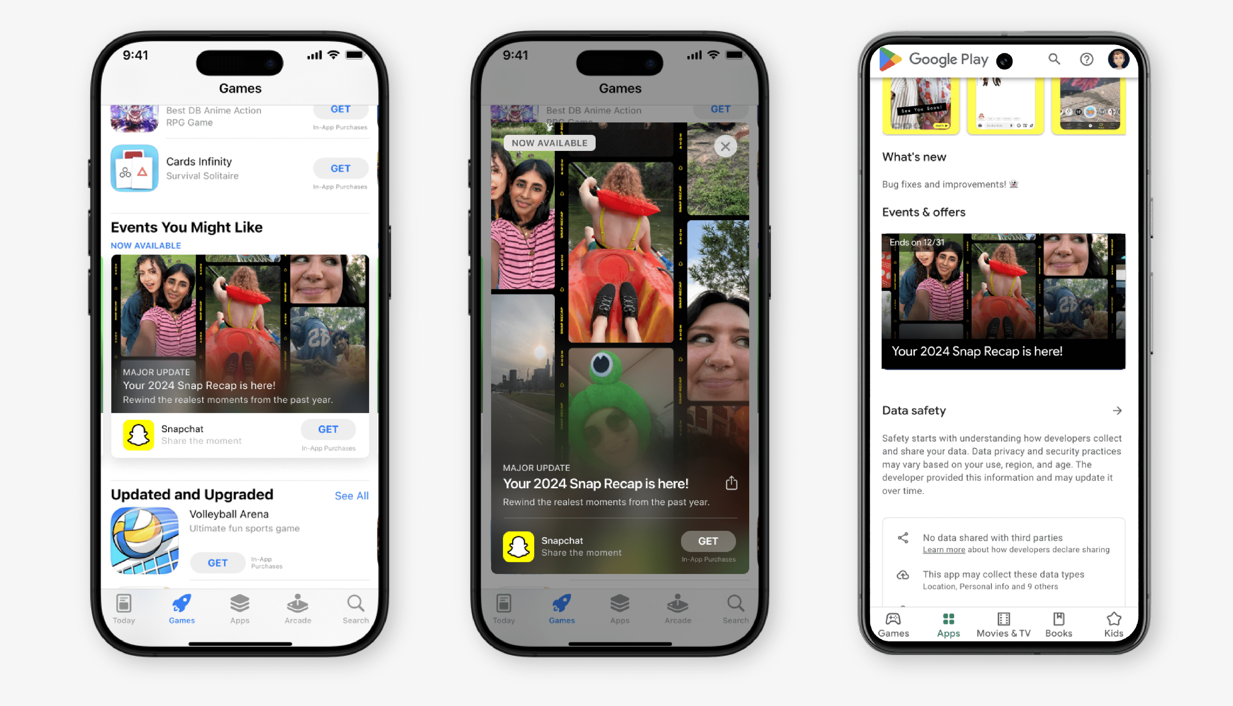 Assets created to highlight Snapchat and the 2024 Snap Recap through several promotional placements across Apple and Google.
