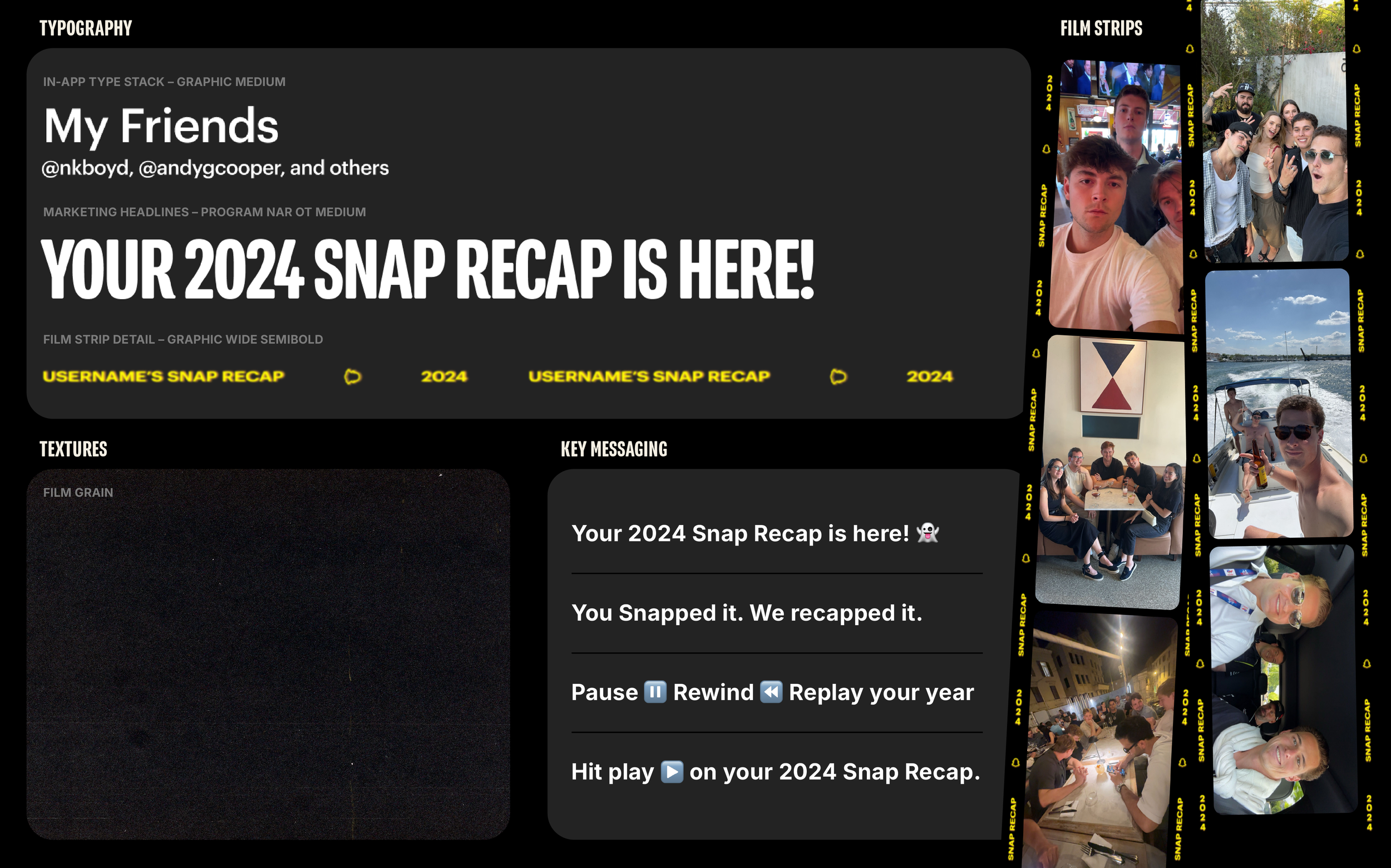 This year’s Snap Recap was inspired by nostalgia – film strips and photo collages. We wanted the Recap to feel like a montage or like flipping through an old photo album. This creative direction touched every piece of the Recap across product and marketing.